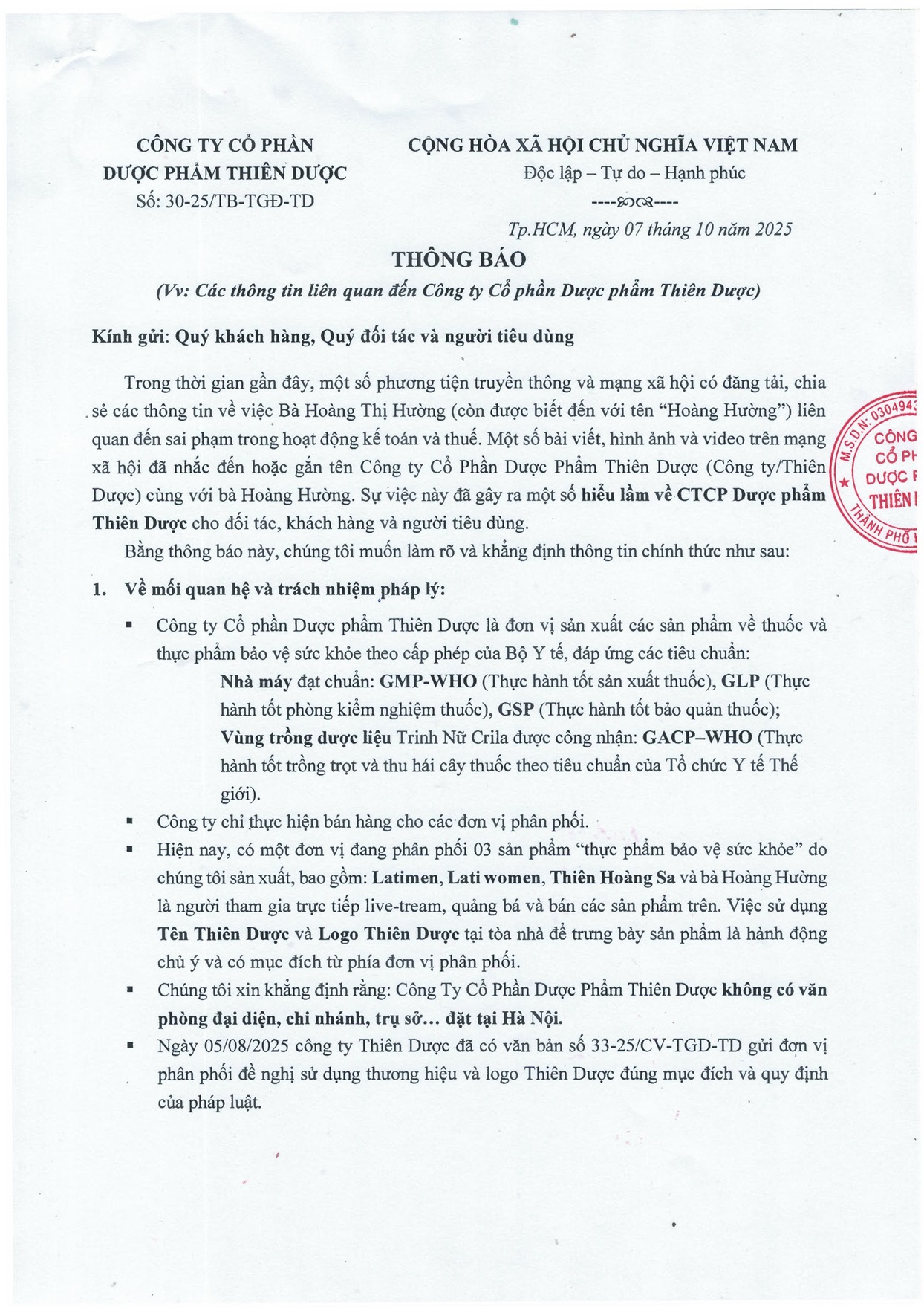 Trong thời gian gần đây, một số phương tiện truyền thông và mạng xã hội có đăng tải, chia sẻ các thông tin về việc Bà Hoàng Thị Hường (còn được biết đến với tên “Hoàng Hường”) liên quan đến sai phạm trong hoạt động kế toán và thuế. Một số bài viết, hình ảnh và video trên mạng xã hội đã nhắc đến hoặc gắn tên Công ty Cổ Phần Dược Phẩm Thiên Dược (Công ty/Thiên Dược) cùng với bà Hoàng Hường. Sự việc này đã gây ra một số hiểu lầm về CTCP Dược phẩm Thiên Dược cho đối tác, khách hàng và người tiêu dùng.