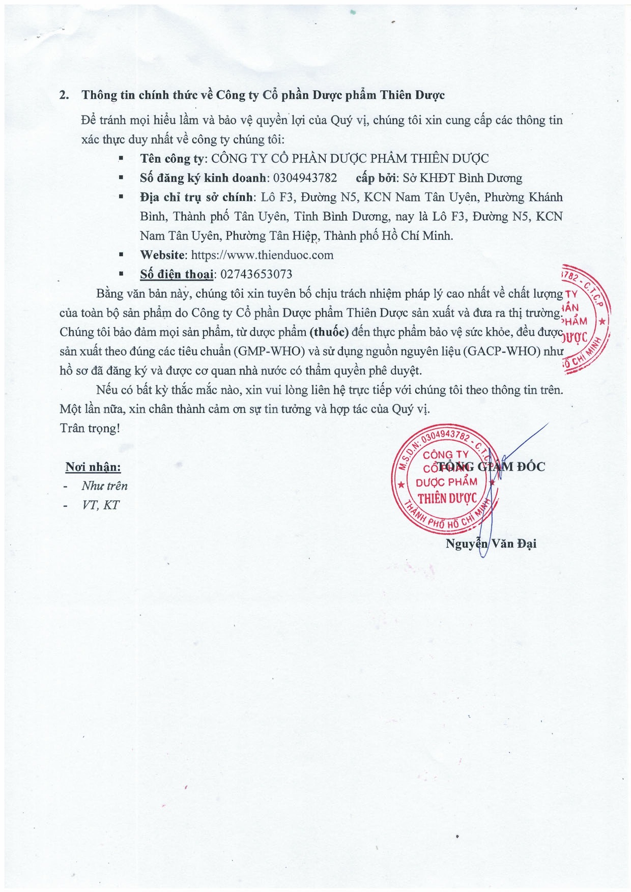 Ngày 05/08/2025 công ty Thiên Dược đã có văn bản số 33-25/CV-TGD-TD gửi đơn vị phân phối đề nghị sử dụng thương hiệu và logo Thiên Dược đúng mục đích và quy định của pháp luật.